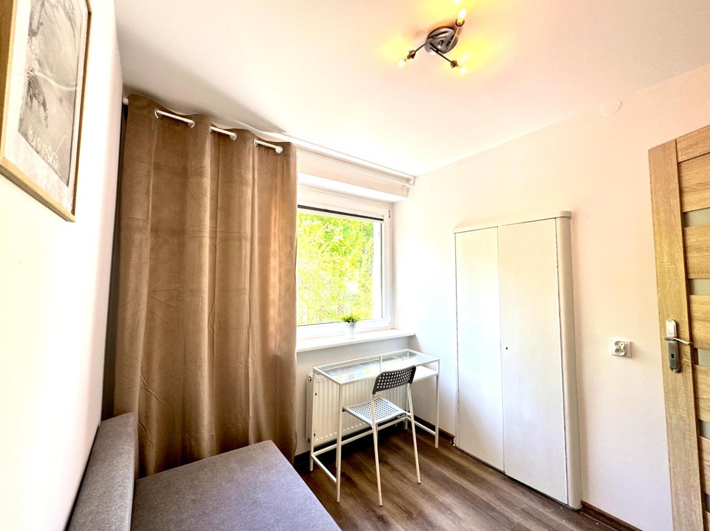 Pokój Dwuosobowy ze wspólną łazienką. The double room offers a washing machine, a dining area, as well as a shared bathroom featuring a bath and a shower. The fully equipped kitchen features a stovetop, a refrigerator, kitchenware and an electric kettle. A wardrobe, parquet floors and heating are featured in this double room. The unit offers 1 bed. Pokój Dwuosobowy - 2 osobowy. Powierzchnia pokoju ok.: 10 mkw.